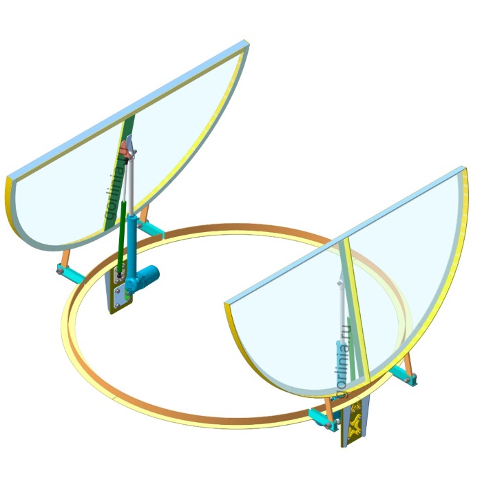 Редукторы подъемника крепятся к вертикальной платформе рамного основания горловины, шток - к импосту стеклопакета. Актуаторы европейской сборки работают синхронно, длина базы и мощность усилия подобраны под массогабаритные характеристики светопрозрачных полукруглых створок.