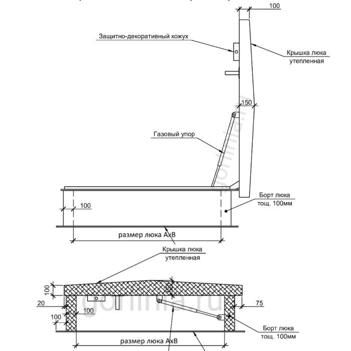 Размер в свету 1000х1500 без учета точечного вылета кронштейнов амортизаторов 45 мм внутрь шахты кровельного колодца.